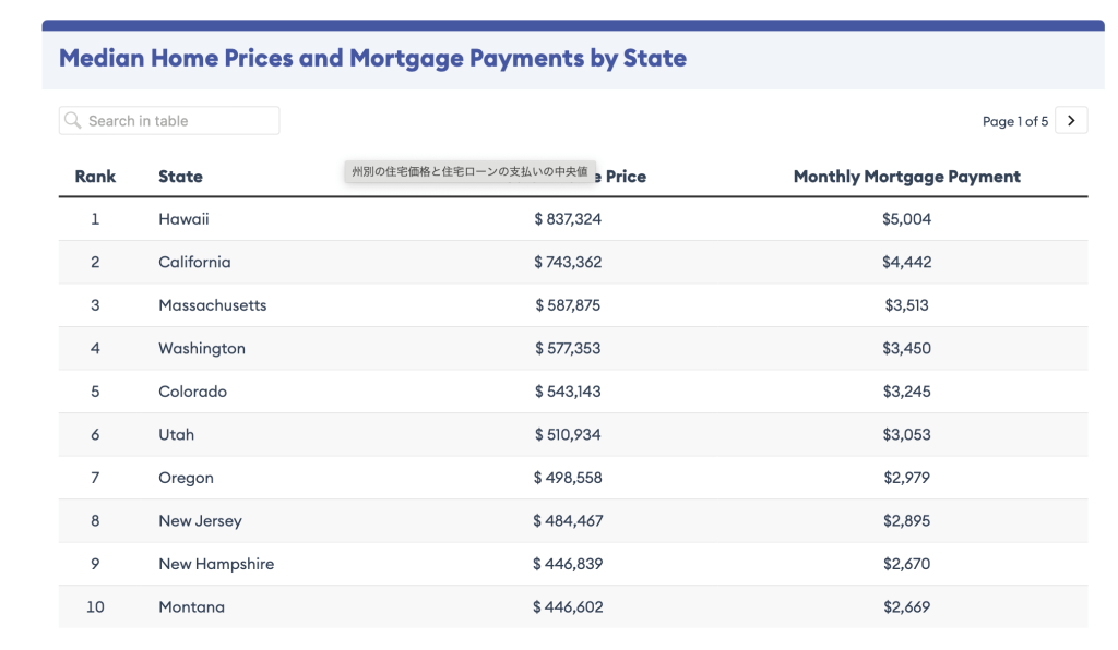カリフォルニアも物価が高くて大変と思っていたけど、ハワイはもっと大変ですね。ハワイについでカリフォルニアが4442ドル、ということは毎月のローンの支払いが69万円くらいですね。カリフォルニアの家の平均の値段が、現在の日本円にすると1億1千万くらいです。でもこの値段で、多分一軒家は買えないですね。住む地域にもよりますが、これだと多分コンド(日本でいうところのマンション)か、もしくはタウンハウスと呼ばれるものだと思います。ハワイは賃貸にしても、持ち家にしても全米で一番高い州になっています。