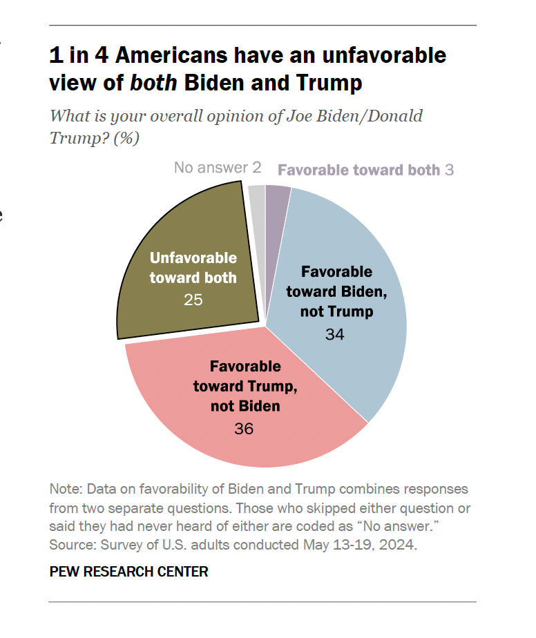 あとこちらはワシントンDCに拠点をおく無党派のシンクタンクで、アメリカと世界の社会問題、世論、人口動向に関する情報を提供しているpew researchセンターが実施したアンケート報告なのですが、これは討論会が行われる前の5月におこなったものです。その報告では、調査を受けたアメリカ人の4分の1バイデン氏とトランプ氏の両方に好意的な見方をしておらず、この2人はここ数十年で最も人気のない主要政党の候補者ペアだったそうです。そしてどちらがより人気があるかどうかは、討論会の前ではわずか2%ですが、トランプ氏のほうが人気があるようですね。討論後にどう変わったかも気になるところです。