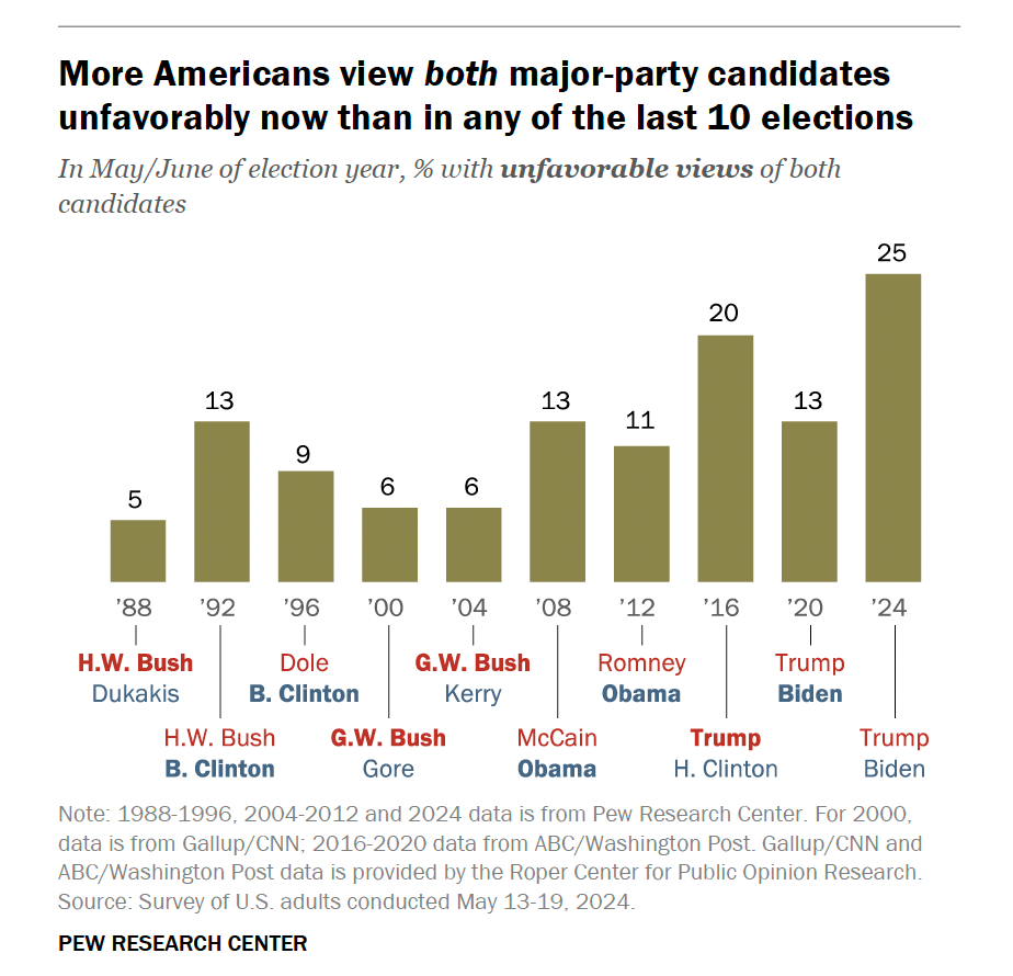 そしてこちらのグラフが過去の主要候補者の不人気ペアの組み合わせです。2016年のヒラリー氏とトランプ氏も悪かったですが、今回は25パーセントなので、それを上回る結果です。