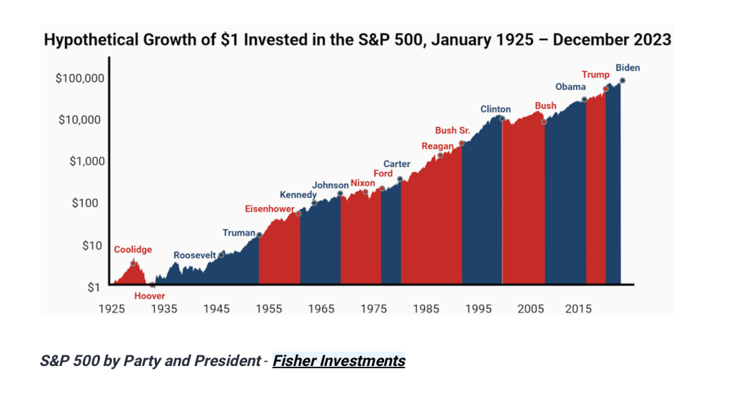 フィデリティの記事を要約すると、 Fisher InvestmentsのチャートではS&P500が権力者や政党にほぼ関係なく、ほとんどどの大統領の間でも上昇し続けていることを示しているということでした。