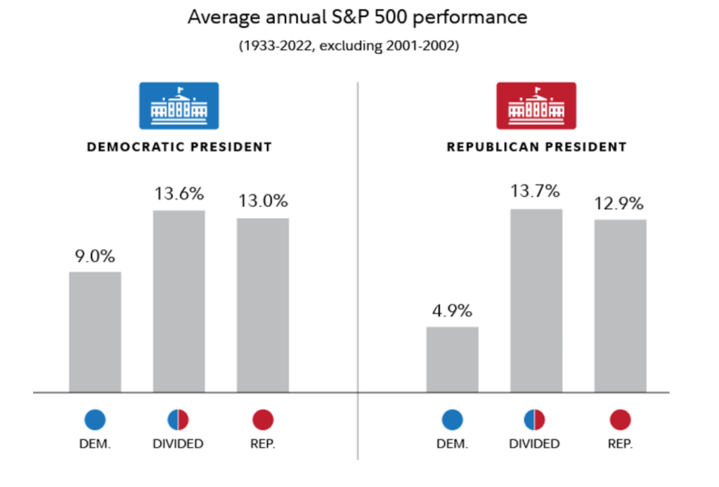 こうしてみると、米国株式は歴史的にほぼ全ての党派的な組み合わせのもとでプラスのリターンを平均化していることがわかります。過去の歴史から見ると、分割された政府がより強いマーケットのリターンを出しているというのも実際見られますが、マーケットの動きは、企業の業績、ファンダメンタル、金利、その他にも世界的な情勢とかあと経済的要因とかもあるので、アメリカの政治のせいだけでこうなっているとは断言はできませんけど。