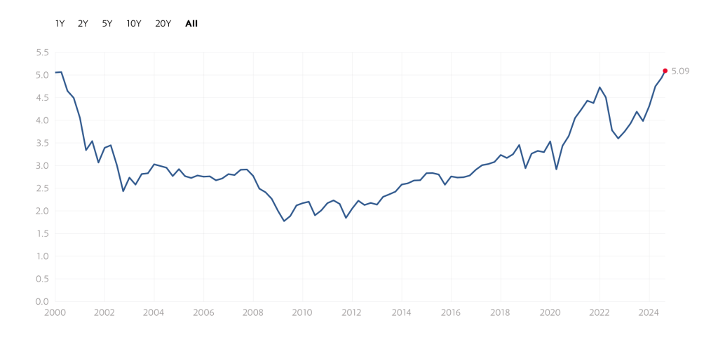 上ののグラフは2000年からのSP500のprice to book valueですが、2024年の8月23日現在は5.09で、かなり高いですよね。