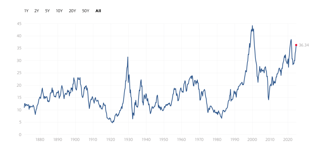 そしてこちらがシラーPEレイシオと呼ばれるもので、投資をしている人の間では割とよく知られていて、多分名前を聞いたことがある方もいらっしゃると思います。昔からこの比率は、一般的に株式指数全般に適用され、市場が過小評価されているか過大評価されているかを見る時に使われることが多いです。検索でShiller PE Ratioと入力すればでてきます。ただ、アメリカでは最近はShiller PE Ratioは将来の収益の、未知の可能性を評価するには正確とは言えないと言う専門家もでてきていてるそうです。