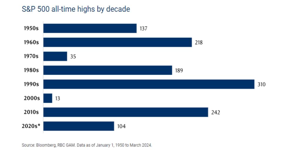 さてここで、アメリカでは史上最高値をつけることが決して珍しくありません。こちらはブルームバーグからの資料ですが、これを見ると1950年代から10年間ずつの間、史上最高値を更新したのは結構あります。