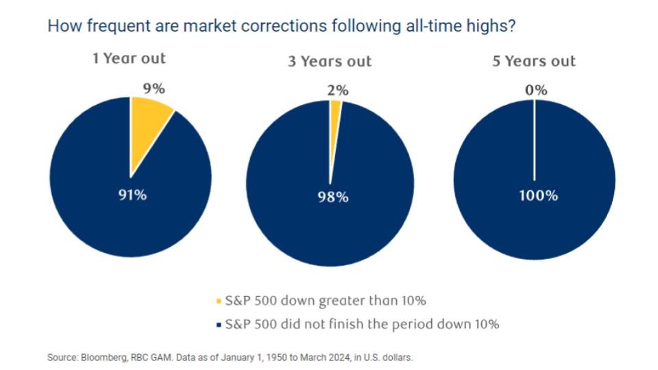 こちらも同じくブルームバーグからの資料ですが、マーケットが史上最高値をだしたあとに左から順に1年先、3年先、そして5年先に10パーセント以上の調整が入る確率を示したのが黄色の部分だそうです。こうやってみると、おもしろいですよね。10%を超える調整は、1年あとだとわずか9パーセントしかなく、5年あとになるとほぼないとなってます。いや、なんか、へぇ~としかいいようがないのですが。そうらしいです。
