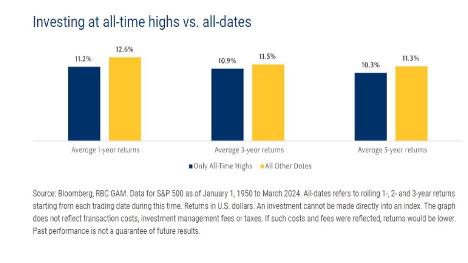 そしてこちらもブルームバーグからのデーターですが、1950年から2024年3月までのS&P 500指数の最高値のみに投資していた場合の成績です。最高値は投資するには「最悪」の時期だと考える人もいますよね。でも、このグラフを見ると、向かって左から1年、2年、3年の期間で、リターンは指数の平均リターンにわりと近いことがわかります。青色のグラフが最高値でのみの投資、そして黄色いグラフがそうでない全日付での投資だそうです。これは1950年から2024年の3月までなので、アメリカマーケットの暴落のあった年、ブラックマンデーとか、ITバブル崩壊、リーマンショック、そして最近でのコロナショックの間も含めてのことです。