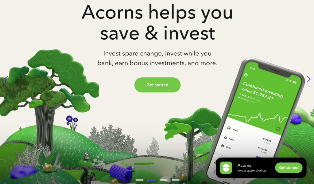 Acornsの方は投資するお金があまりない若者や投資には不慣れな人のために、投資を定期的に、アクセスしやすく、手頃な価格にするために設計されているそうです。と言うのも、Acornsは投資を若者の消費行動に落とし込んでいて、例えば若者がスタバで一杯のコーヒーをクレジットカードで買う。それが4ドル39セントだとする。自分が利用するクレジットカードをAcornsに登録しておいて、そのクレジットカード上ではラウンドアップ、繰り上げ四捨五入されるので5ドルを払ったら、Acorns上で残りの61セントの端数が自分の選んだポートフォリオの中で投資に回されると言うシステムらしいです。へぇ、なるほどなぁと思いました。消費行動の中で、小さな投資を続けてすることによって消費行動パターンを利用した投資の方法だそうです(Acornsには低額ですが毎月使用料がかかります)。