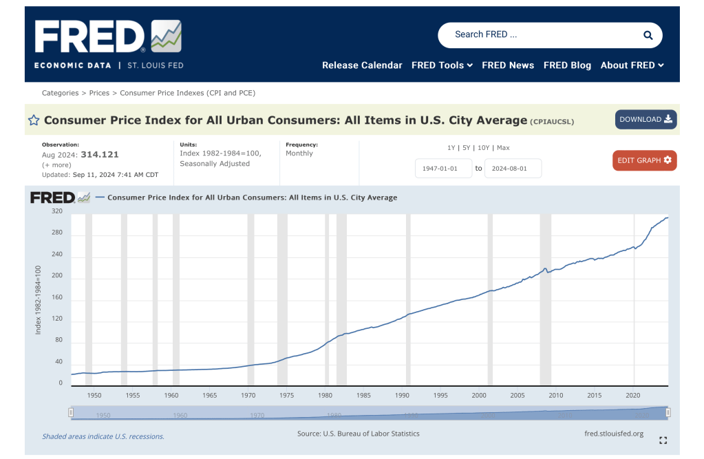 パンデミック中のサプライチェーンの問題で急激に上がったインフレの時を除いても、それでもアメリカはほぼ毎年インフレでモノの値段が少しずつですが上がっています。