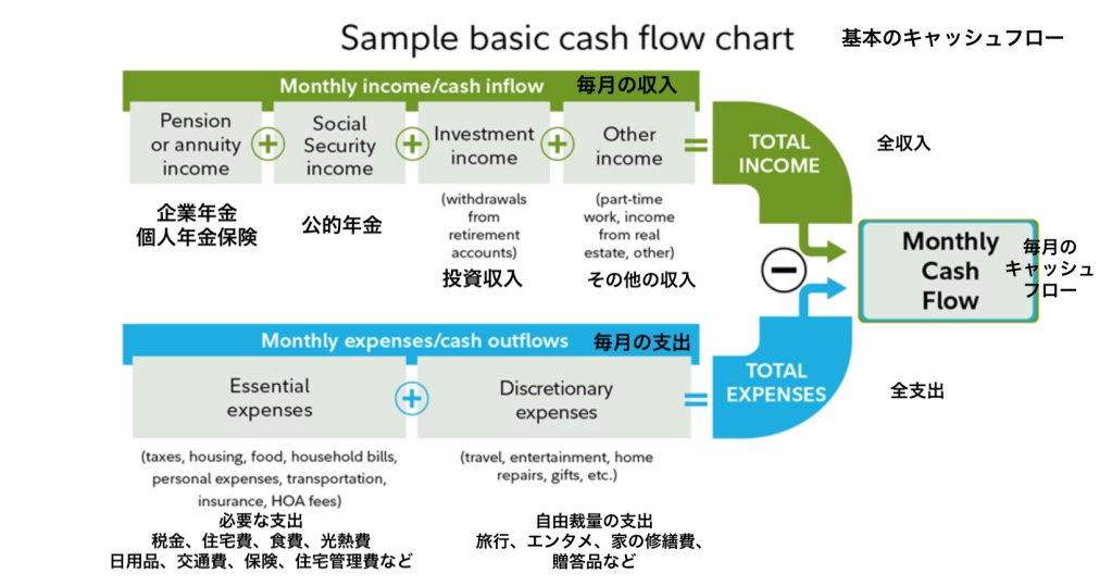 まず、キャッシュフローってなに?と思われた日本人の方は、キャッシュフローは、毎月出たり入ったりする現金の量を意味します。こちらの図はフィデリティからのものですが、わかりやすいかなと思ってお借りしました。