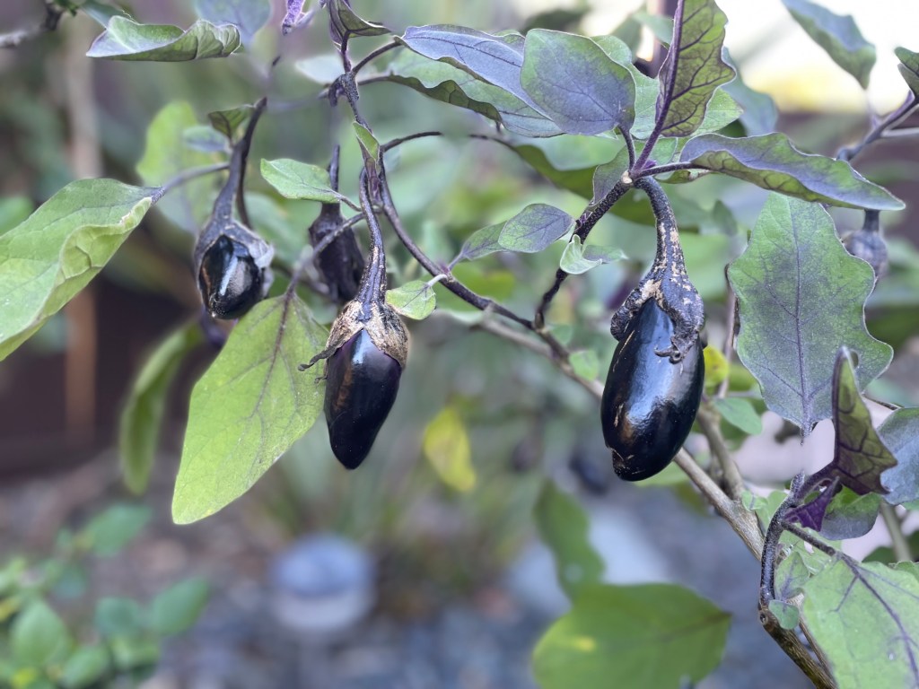 ワシントン州でも茄子は家庭菜園で育てていたけど、サンディエゴでは初めて茄子が越冬することを知りました。いつもは冬に抜いちゃうんだけど、今年は暖かくて実がついてたからそのままにしていたら、どんどん増えてきました!